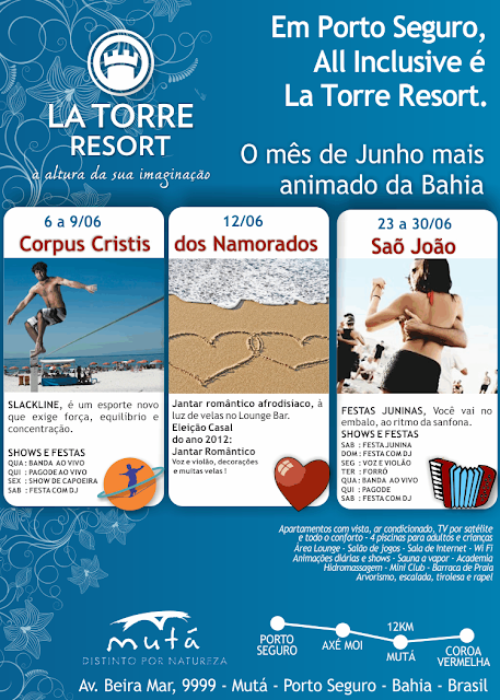 12 de junho La Torre Resort comemora a data em alto estilo O Lounge Bar do La Torre será o local escolhido para os casais apaixonados comemorarem a data que é tão lembrada em todo Brasil. Dia em que as pessoas relembram a data em que se encontraram ou mesmo fortalecem o laço de amor. Pensando nisso, o La Torre Resort montou uma programação que promete ser inesquecível. Sob o comando do Chef de cozinha Internacional Peter Lambrechts, o jantar à luz de velas acontecerá no mais novo espaço do hotel. Este que foi inaugurado na última noite do réveillon, o Lounge Bar do La Torre terá uma decoração à altura da sua imaginação. Com um ambiente, elegante e acolhedor, o local é propício para se comemorar essa data que é tão romântica e especial. O renomado Chef de cozinha Peter Lambrechts veio diretamente da Bélgica e está no Brasil há 08 meses. Segundo ele, o jantar terá um toque afrodisíaco. A especialidade dele é a cozinha francesa, cozinha molecular (com espumas de frutas, ervas frescas e molhos que são chamados de “pomadas”) e cozinha regional europeia, este diz ter “receitas milenares”. E para o dia dos namorados os pratos irão surpreender com temperos e alimentos afrodisíacos: ostras, ervas como açafrão, figo, aipo e outros que são segredos da culinária do chef que fez escola de hotelaria em Bruchelas e começou a trabalhar aos 13 anos no Restaurante Astória – Bélgica. Após o mestrado em culinária ele viajou por toda Europa; França, Alemanha, Espanha, Itália, Áustria, Holanda e outros tiveram o privilégio de experimentar o tempero do Peter que agora se encontra em Porto Seguro e trabalha exclusivamente para o La Torre Resort. As delícias da Nativa Clube de Praia e do La Torre Resort tem a assinatura de Peter que faz verdadeiras obras de arte na cozinha. O cardápio será cuidadosamente preparado para atender e agradar o gosto exigente e refinado dos nossos clientes. Com uma decoração que promete ser a surpresa da noite, mas já reforçando que a luz de velas não irá faltar; o lounge servirá também de palco para uma música suave, mas sem deixar de valorizar a cultura regional com um belo show de lambada. Jerusa Brandão/Mídia Mutá