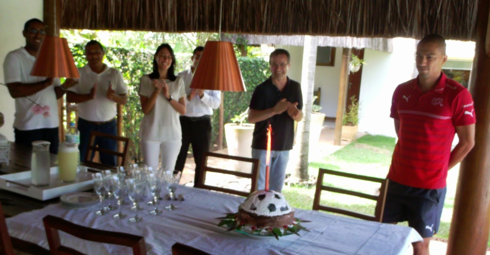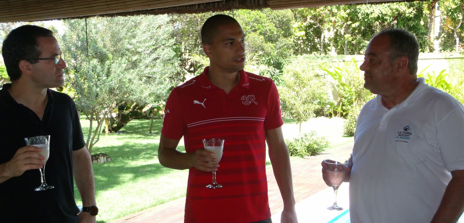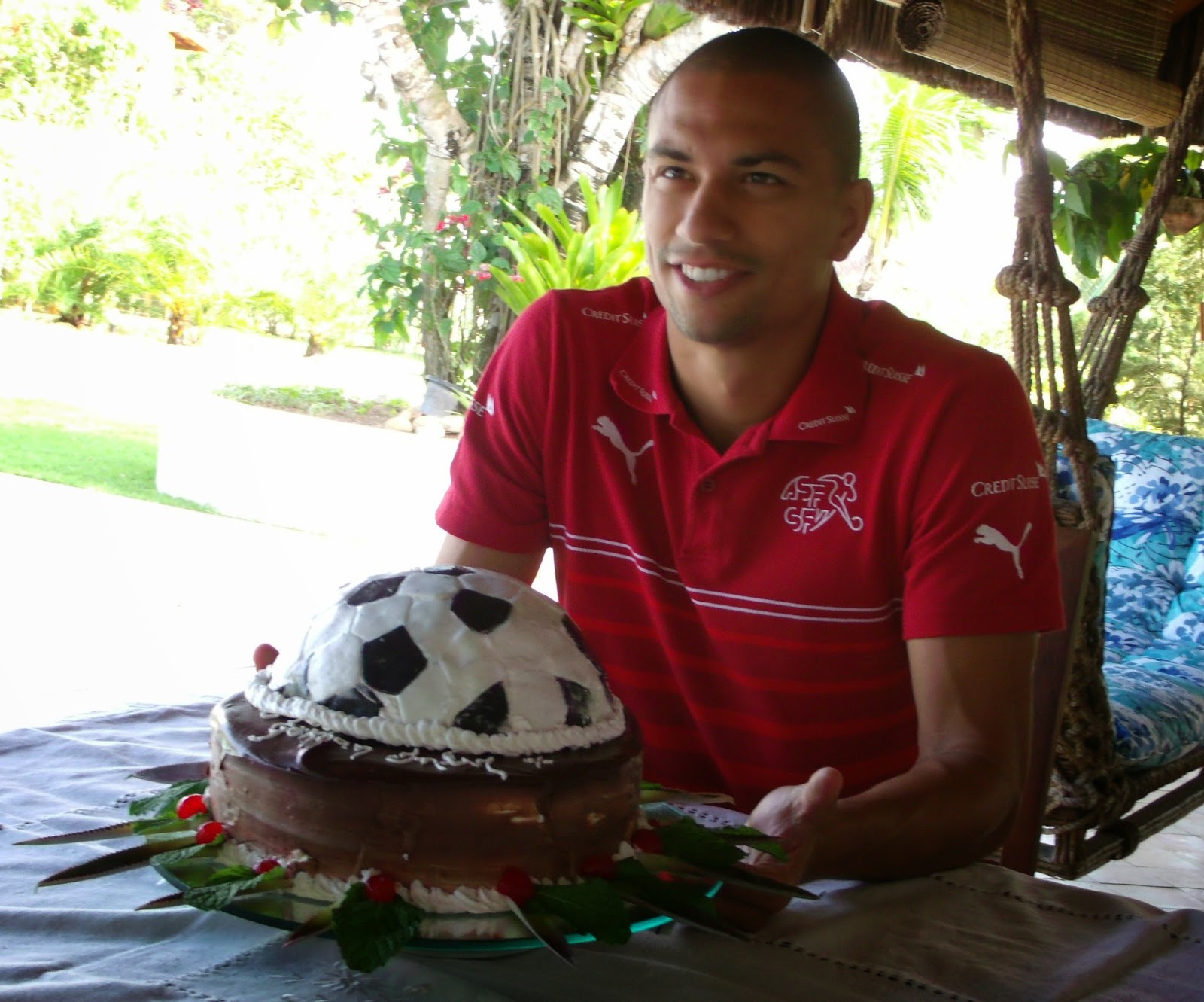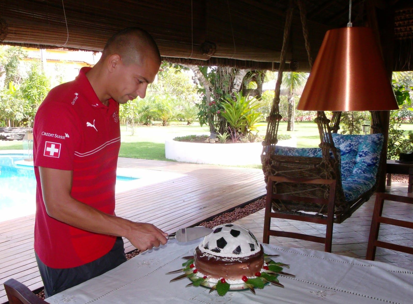 A manhã desta sexta-feira, 27 de junho começou em festa no La Torre Resort comemorando o aniversário do Capitão da Seleção Suíça Gökhan Inler. Atualmente Inler é meio campista do Napoli da Itália, mas tem se destacado para o mundo com suas atuações nesta Copa pela Seleção Suíça. Líder de uma equipe que tem surpreendido a todos pelo excelente desempenho e dado esperanças à população de seu país, Gökhan Inler diz que sonha com a final Brasil e Suíça neste mundial. “Agora que a Copa do Mundo vai começar!” Afirma o capitão ao comentar sobre as expectativas para o próximo jogo contra a Argentina. Inler elogiou muito a receptividade e o apoio do povo brasileiro e se disse muito bem no La Torre Resort, acomodação escolhida pela Delegação Suíça, “um dos melhores centros de treinamento que já conheci em Copa do Mundo. Com áreas amplas e bem privativas, apartamentos confortáveis, atendimento personalizado. Estou muito bem aqui”, completou o aniversariante ao conversar com os diretores Luigi Rotunno e Jean Pierre, grandes responsáveis na captação de Seleções para a Costa do Descobrimento.
