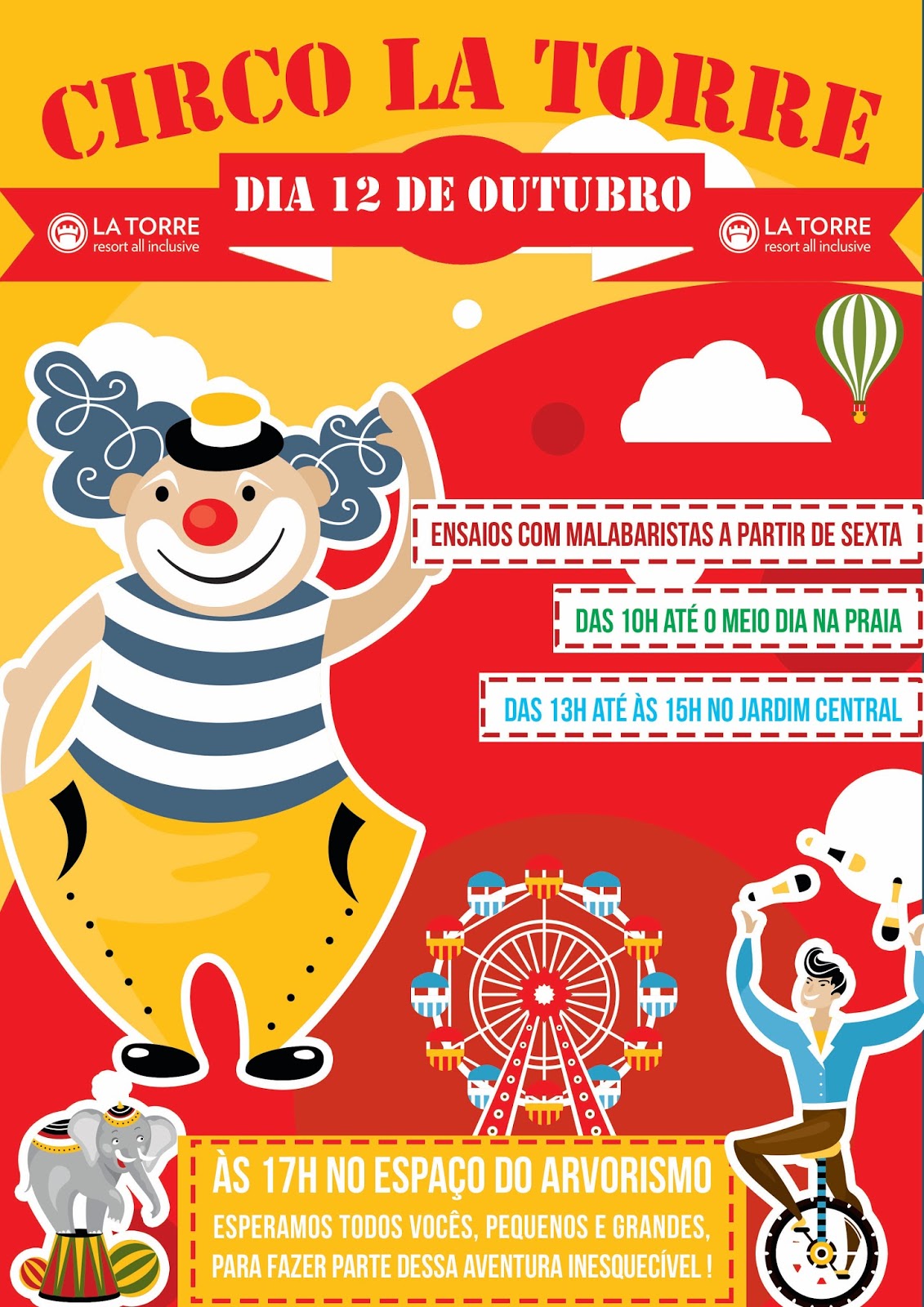 O Dia das Crianças ni La Torre Resort de Porto Seguro-BA será em clima de Circo com brincadeiras e atividades em tema. Os ensaios com malabaristas começam a partir de sexta, e serão realizados das 10h até o meio dia na praia, das 13h até as 15 h no jardim central e às 17 no espaço do arvorismo.