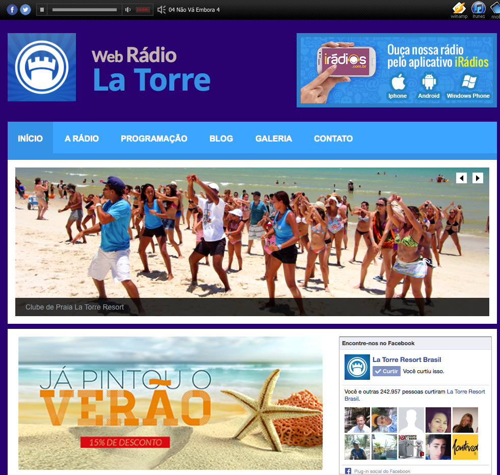 Uniformizar o ambiente musical em todas as dependências do La Torre Resort, transmitir comunicados e permitir ao hóspede de manter um laço com o resort depois das férias. Esses são alguns dos objetivos da Web Rádio, criada pelo La Torre Resort de Porto Seguro para seus hóspedes. “Mais do que um som ambiente a nova Web Rádio é uma verdadeira programação musical”, explicou o diretor geral do La Torre Resort, Luigi Rotunno, “é um avanço tecnológico que cria uma dinâmica maior entre o hóspede e o resort, hóspede que vai poder ouvir a rádio mesmo depois das férias”. A Web Rádio La Torre pode ser ouvida no endereço: www.radiolatorre.com.br Antonio Alberghini / Mídia Mutá