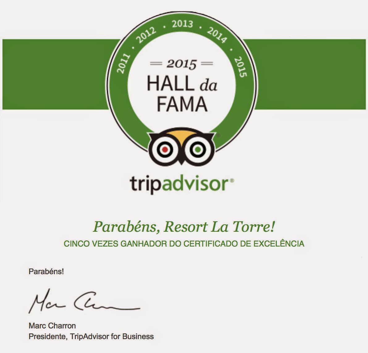 Com mais de 300 milhões de visitas mensais, o Tripadvisor, o maior site de viajantes do mundo, elege para o Hall da Fama, apenas estabelecimentos que conquistam o certificado de excelência por cinco anos consecutivos. Em 2015 o La Torre Resort All Inclusive, da Praia do Mutá em Porto Seguro entrou para esse seleto grupo do Hall da Fama. " 5 anos consecutivos buscando melhorar nosso Resort La Torre, sempre colocando nossos hóspedes no centro das atenções”, comentou o diretor geral do La Torre Resort, Luigi Rotunno, “ficamos muito felizes com esse resultado."