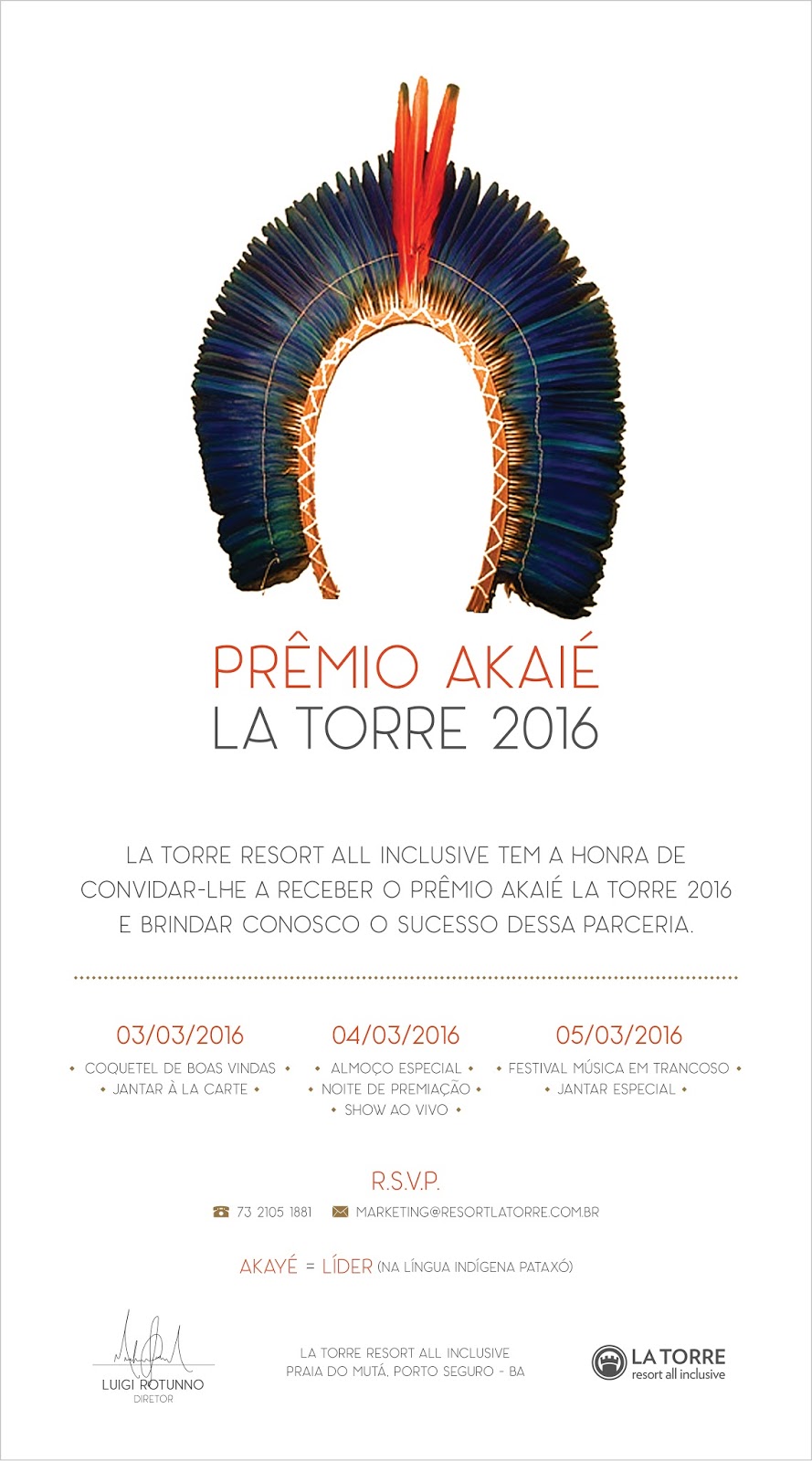 Com programação recheada de surpresas, o Prêmio Akaié La Torre 2016 levou 18 dos principais parceiros do Trade para passar um final de semana descontraído e conhecer um pouco mais da “essência La Torre”, entendendo as particularidades deste Resort que se fez destino turístico na Bahia, compartilhando experiências mútuas e contribuindo para o crescimento de todos. Neste 1º Prêmio Akaié La Torre, além das principais operadoras e agências do Brasil, 05 colaboradores do Resort foram premiados e se emocionaram com a surpresa. “Iniciamos 36 e hoje somos 401. O meu maior objetivo é criar mais empregos. Me sinto realizado com isso, pois vejo que a cada vaga é uma oportunidade a mais de melhorar a vida das pessoas”. Expressou Luigi Rotunno, Diretor Geral do Resort La Torre na noite de premiação aos convidados. Na ocasião Luigi ressaltou a importância de uma equipe sólida e de objetivos bem traçados, assim como, a importância de projetos sociais que se preocupam com o colaborador, a exemplo dos projetos vigentes na empresa, tais como: Empréstimos a colaboradores para investimento em construção, saúde e educação, treinamento de liderança, treinamento de ambulantes, entre outros. O evento teve duração de três dias, iniciando-se com um jantar de boas vindas no Restaurante À La Carte La Torre (03/03), Passeio de Escuna exclusivo saindo da Praia do Mutá, Almoço no Clube de Praia La Torre, Jantar e Show de Premiação no Parque de Eventos La Torre (04/03), 5º Festival de Música em Trancoso e Jantar de encerramento no Bistrô D’Oliveira em Arraial D’Ajuda (05/03). Cobertura fotográfica completa nos álbuns na página Facebook La Torre Resort Brasil https://business.facebook.com/latorreresortbrasil/photos_stream?tab=photos_albums Empresas Premiadas e seus respectivos representantes: OPERADORAS TOP 10 CVC – Claiton Armelin VISUAL – Renato Kido AZUL – Antônio Boldrin TAM – Jamir Esmi MASTER – Daniel Dias ZARPO – Karen Garcia FLYTOUR – Daniel Firmino e José Emerson Amaral TURNET – Renato Carone TREND – Dyogo Schroeder OPERADORAS DESTAQUE MMT GAPNET- Renata Maida e Tatiana Garcia FRT – Daniele Meireles AGÊNCIAS DE VIAGENS MULTITOUR – Juliana Carvalho PERSONAL – Paula Alame BELVITOUR – Lázaro Resende TASTUR – Ezio Athaide ANCORADOURO – Fabíola Ferreira MÍDIA MERCADO E EVENTOS – Anderson Maseto PANROTAS – Hugo Okada COLABORADORES DESTAQUE WILSON XAVIER – Supervisor Finaceiro RAINER CASTRO – Supervisor A&B SANDRA ALVES – Auxiliar de Compras ERIVELTON SILVA – Gerente de Manutenção RODRIGO CAMPECHE – Supervisor Revenue Managment
