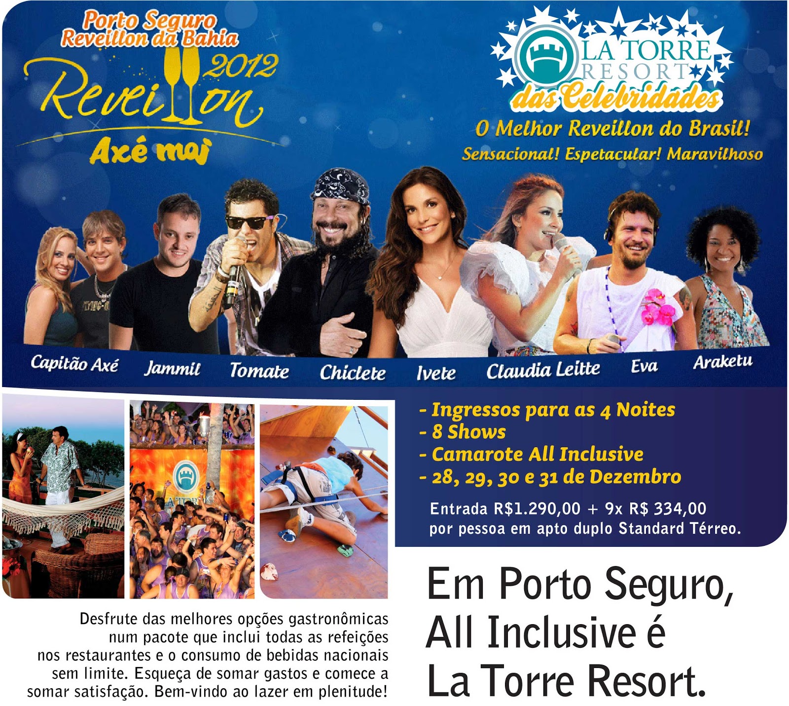 La Torre Resort terá duas programações para o réveillon No Hotel Piscina Central onde será comemorada a noite de réveillon. Para atender o gosto variado dos seus clientes, o La Torre Resort, tradicional hotel de infraestrutura direcionada ao público familiar e localizado na Praia do Mutá, Orla Norte de Porto Seguro, estará realizando duas programações para o final de ano; uma para quem deseja passar um final de ano mais tranquilo juntamente dos seus familiares e outra para os que pretendem passar o réveillon curtindo a boa música baiana na voz dos melhores cantores do Axé Music do país. La Torre Resort fica na tranquila Praia do Mutá - Orla Norte de Porto Seguro. A comemoração no hotel terá início às 20h30 na Piscina Central. As bandas “Swingão Klasse A” e “Samba e Prosa” farão o repertório da noite. À meia noite, contagem regressiva com um belo espetáculo de fogos de artifício e muito champagne, além de um delicioso jantar com cardápio tipicamente brasileiro. Na Arena Axé Moi O tradicional Réveillon da Arena Axé Moi, um forte parceiro do Resort La Torre, está na programação do hotel para o final do ano. Com quatro noites de festa e oito bandas renomadas no cenário nacional, o La Torre criou o pacote RÉVEILLON 2012 Axé Moi – La Torre Resort. Adquirindo o pacote de 07 noites no La Torre os clientes terão acesso à melhor festa da região com total conforto e segurança. Traslado para o evento A aproximadamente dez minutos do hotel, os hóspedes terão a comodidade de ir ao local da festa com total segurança; o traslado é mais um serviço que o La Torre dispõe para seus clientes. O cliente La Torre, além do sistema All Inclusive que, em Porto Seguro, só o La Torre oferece, ficará no Camarote Open Bar onde além das bebidas, todos os tipos de caldos sem custar nada a mais. O Ponto de Encontro dos clientes La Torre no final de ano é no Camarote Vip da Arena Axé Moi; um espaço amplo, confortável, com total visibilidade para o palco central e trios elétricos. Segurança, conforto e comodidade; itens essenciais para o La Torre Resort e seus clientes. Venha “fazer a contagem regressiva” conosco na Arena Axé Moi. Estilo e atrações de renome nacional este é La Torre Resort, sempre inovando para agradar ao gosto exigente dos seus clientes. Noite das Crianças Os pais têm a opção de irem ao show com total conforto e deixar suas crianças, a partir de 04 anos de idade, em segurança com os monitores do Kid Club. A partir das 20h, profissionais desse setor, estarão disponíveis para cuidar dos seus filhos enquanto os pais se divertem e aproveitam as festas do final de ano até o retorno. Programação: 28/12 – Ivete Sangalo + Jammil e Uma Noites; 29/12 – Cliclete com Banana + banda Eva; 30/12 – Cláudia Leitte + Araketu; 31/12 – Banda Capitão Axé + banda Tomate (Contagem Regressiva). Jerusa Brandão/Mídia Mutá