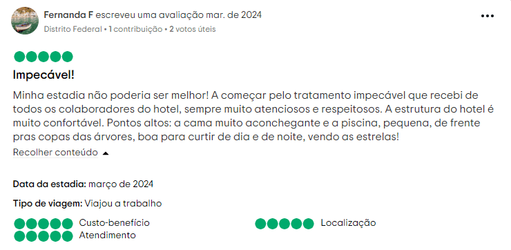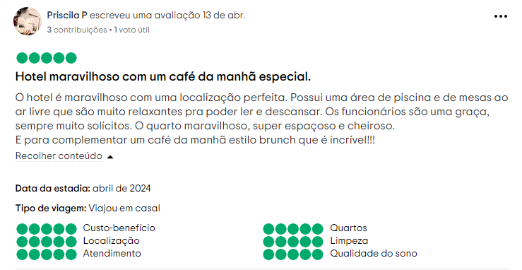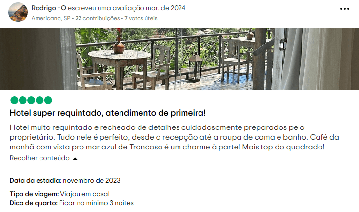 O Hotel Boutique Casa La Torre, que faz parte do Grupo La Torre, acaba de receber o concorrido prêmio do "Travellers Choice 2024 - Best of the Best, concedido pelo TripAdvisor, ficando em 3° lugar como melhores hotéis de Trancoso na classificação dos hóspedes. O prêmio anual, apenas é oferecido para os hotéis com grande volume de avaliações positivas em um período de 12 meses, sendo esse o maior reconhecimento de uma das mais confiáveis plataformas do mundo. Esse ano foram analisados 8 milhões de perfis e menos de 1% atingiram o nível de excelência necessário para alcançar esse marco de melhores hotéis. Para a concessão do selo são levados em consideração a qualidade, quantidade e classificações publicadas durante todo ano, por pessoas do mundo inteiro que usufruíram do serviço de hospedagem. Segundo Luigi Rotunno, CEO do Grupo, “La Torre é exemplo de excelência em serviços, de qualidade no atendimento e busca incessante por inovação, preservando o meio ambiente, respeitando as culturas populares de nossa região, surpreendendo os viajantes e fazendo com que levem na bagagem o amor dessa gente hospitaleira”. Sobre o Hotel Casa La Torre O charmoso Hotel Boutique Casa La Torre está situado no Quadrado de Trancoso/BA , possui uma belíssima vista para o mar, piscina integrada à natureza e delicada decoração que remete às raízes do vilarejo. É o equilíbrio perfeito entre o que há de mais encantador na natureza e mais sofisticado, sendo um dos melhores hotéis da região. A atmosfera inspiradora, se misturam com muita elegância e aconchego, aliado a um atendimento personalizado. A valorização dos detalhes, transformam a hospedagem em um momento genuíno e inesquecível para os que escolhem o Hotel Casa La Torre. Confira alguns depoimentos de hóspedes no TripAdvisor: O reconhecimento desse prêmio é muito importante para nós e reforça o nosso comprometimento em promover cada vez mais momentos especiais, durante a sua visita à Trancoso. Faça aqui sua reserva no Hotel Casa La Torre e viva dias inesquecíveis. Saiba mais sobre o Grupo La Torre aqui.