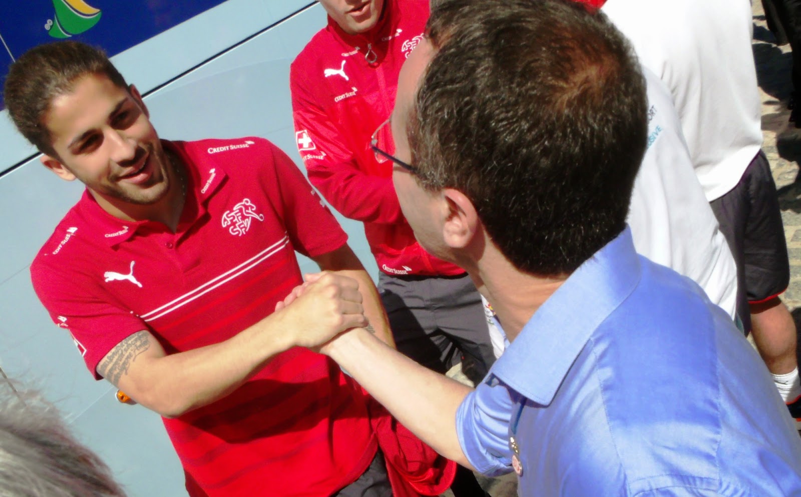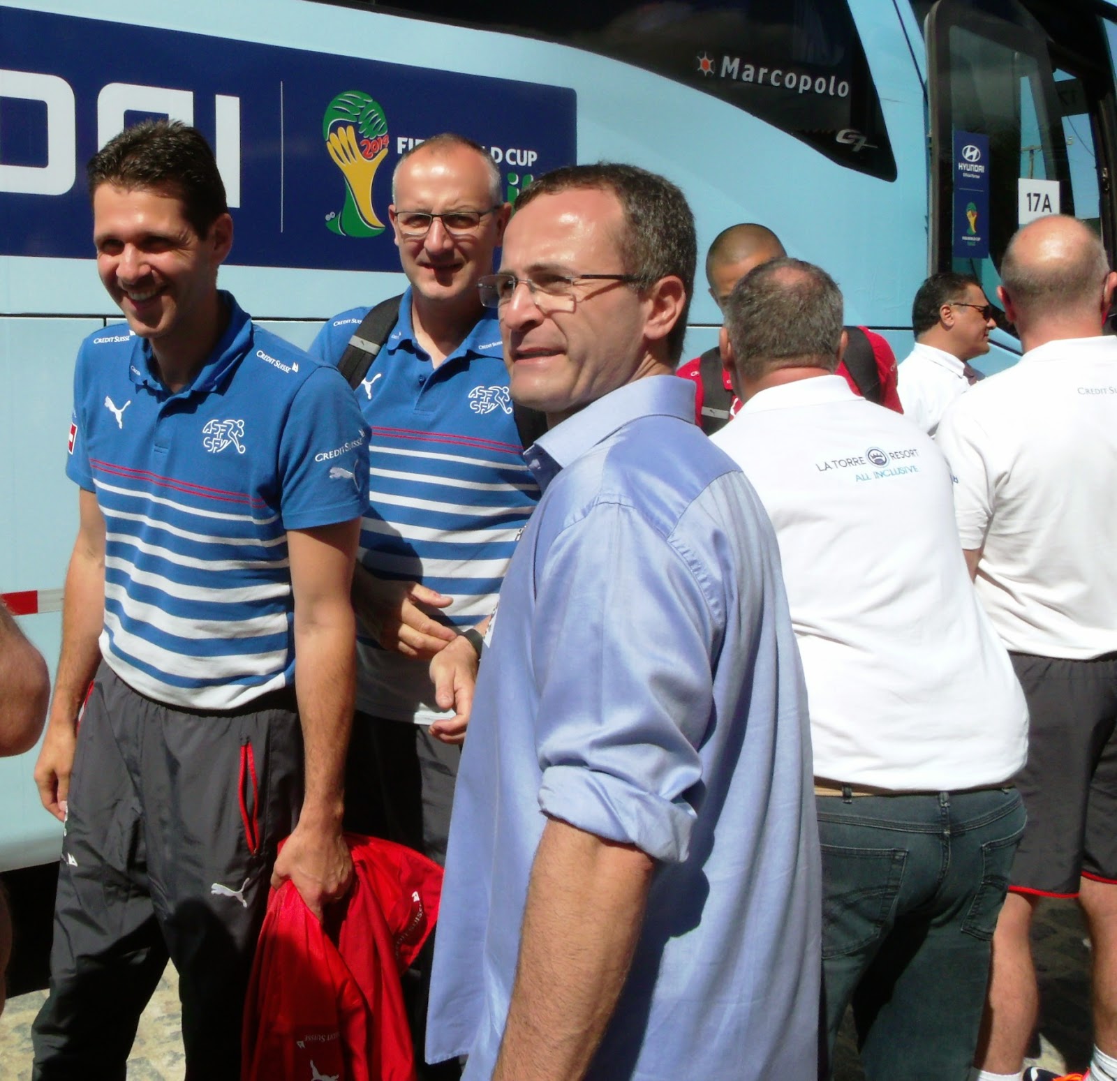 A seleção da Suíça já está no La Torre Resort de Porto Seguro, localizado na Praia do Mutá. Os jogadores e técnicos suíços chegaram por volta das 10h30min e foram recebidos por estudantes com bandeiras suíças e brasileiras, faixas torcendo pela suíça. O secretário geral da confederação suíça de futebol Alex Miescher foi convidado no palco das autoridades e músicos da orquestra sinfônica tocaram o hino da Suíça e do Brasil. Capoeiristas se exibiram chamando a atenção dos suíços. “É um dia esperado há muito tempo, um sonho que se concretiza e um momento de muita emoção”, comentou o diretor geral do La Torre Resort, Luigi Rotunno. A prefeita de Porto Seguro, Cláudia Oliveira deu as boas vindas a técnicos, jogadores e imprensa, “Sintam-se em casa e aproveitem toda a beleza da Bahia, Porto Seguro é uma cidade para viver felizes”. A seleção da Suíça começará os treinos hoje e amanhã (7 e 8/6) no Estádio Municipal Antônio Carlos Magalhães, no centro da cidade. Antonio Alberghini / Mídia Mutá