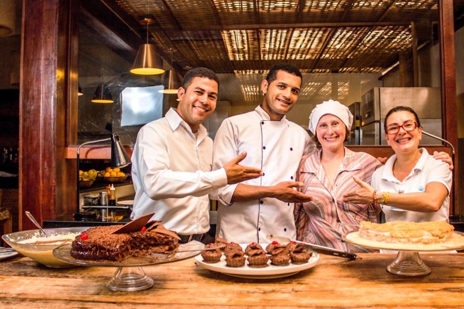 Uma iniciativa inédita e gostosa foi proposta por uma hóspede do La Torre Resort na última semana. A experiência foi incrível e já inspirou em novas atividades que estão por vir no resort baiano. Doceira profissional em Minas Gerais, a hóspede Micheline Ferreira se ofereceu para ensinar algumas de suas receitas de família ao confeiteiro do resort. “Ela nos procurou e disse que fazia uma ambrosia maravilhosa se poderia nos passar a receita, quando eu aceitei, ela ficou empolgada e se ofereceu para ensinar o passo a passo ao nosso confeiteiro”, contou a gerente de alimentos e bebidas do La Torre, Gi Del Santi. Além de ensinar a receita da ambrosia, Micheline aproveitou também para compartilhar as suas receitas de torta de amendoim e de pão de mel. Por dois dias o confeiteiro Nailton se divertiu com a hóspede fazendo o passo a passo das tradicionais receitas de família na cozinha do Restaurante à La Carte do La Torre. “É sempre bom aprendermos novas receitas. Vamos fazer alguns ajustes em relação a custos e colocá-los junto aos novos doces do cardápio do resort. Ter a oportunidade de aprender algo novo com os hóspedes e compartilhar com eles o nosso conhecimento foi uma experiência maravilhosa”, disse o confeiteiro. Micheline afirmou ter ficado muito feliz em poder vivenciar essa experiência em uma cozinha industrial e compartilhar com a equipe do resort receitas de família que serão apreciadas por milhares de pessoas em férias no La Torre. Por Eduarda Toralles / Mídia Mutá